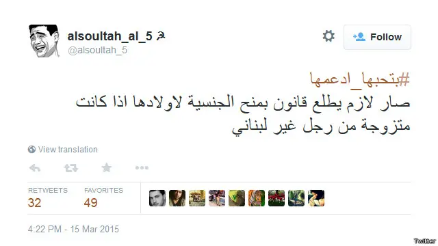 ونادي البعض بإجراء تعديلات تشريعية تمنح المرأة اللبنانية المزيد من المزايا، من بينهم المستخدم alsoultah_5@ الذي اقترح إعطاء الجنسية لطفل لبنانية، إن تزوجت رجلا ليس لبنانيا.