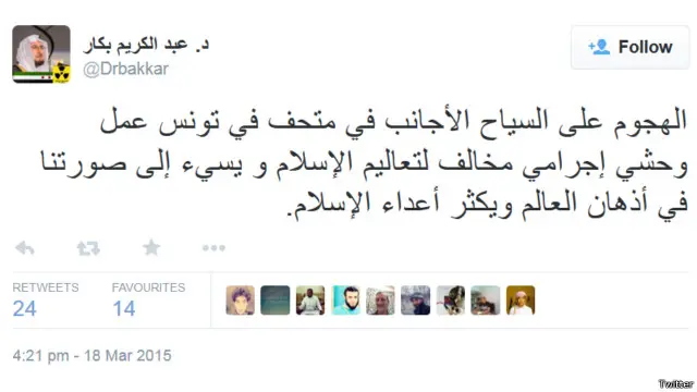 واستنكر المستخدم Nasser H Al-Khalifa الهجوم وقال في تغريدة له: "ما جرى في تونس محزن ويدل على أن هناك من لم يعجبه نجاح الشعب التونسي في حماية ثورته من شرور العنف بعد نجاحها. اللهم احفظ تونس وأهلها."