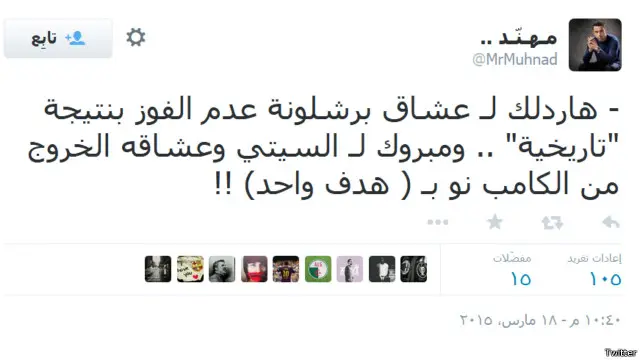 وعبر المستخدم "عبدالرحمن فهد" عن استمتاعه بأداء برشلونة: "برشلونة إبداع وإمتاع وإقناع. لو استمر هالمستوى (بهذا المستوى) بالكلاسيكو راح (سوف) يفوز برشلونة بنتيجة عريضة بشرط عدم تضييع الفرص. تحية لإنريكي على هذا الأداء!".