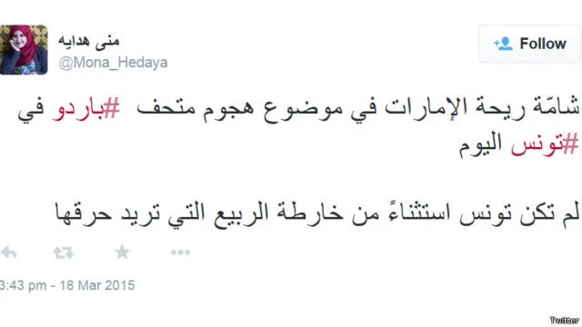أما المستخدمة منى هداية فقد اتهمت دولا في المنطقة بالوقوف وراء الحادث لإحراق ما سمته "خارطة الربيع" العربي، وقالت في تغريدة لها: "شامّة ريحة الإمارات في موضوع هجوم متحف #باردو في #تونس اليوم لم تكن تونس استثناءً من خارطة الربيع التي تريد حرقها."