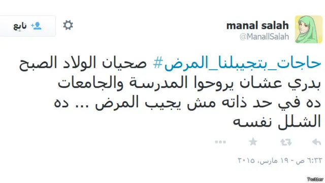 دشن نشطاء على موقع التواصل الاجتماعي تويتر هاشتاغ #حاجات_بتجيبلنا_المرض، للتعبير عن بعض مظاهر الحياة اليومية في المجتمع واعتبرها المستخدمون مظاهر سلبية، وكذلك طرق معالجتها.