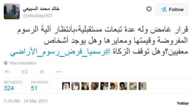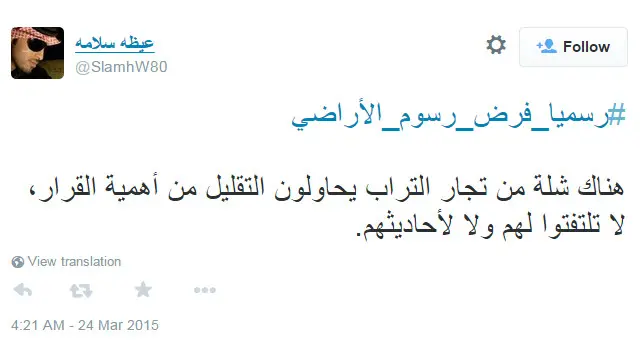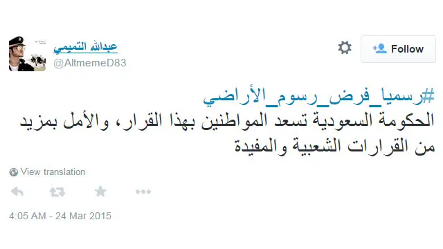 وفي السعودية، شهد هاشتاغ #رسميا_فرض_رسوم_الأراضي تفاعلا على نطاق واسع بعد قرار مجلس الوزراء السعودي فرض رسوم على الأراضي غير المطورة الواقعة في نطاق التكتلات العمرانية بالمملكة.
