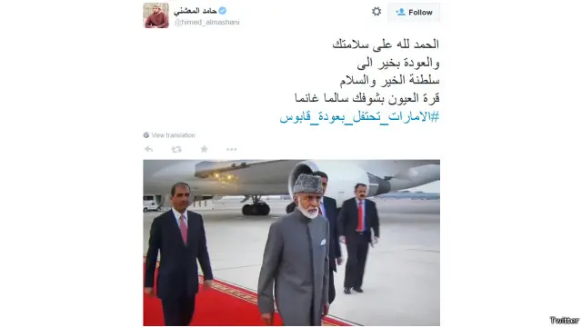 في عمان، احتفل مستخدمو موقع التواصل الاجتماعي تويتر بعودة السلطان قابوس بعد رحلة علاجية إلى ألمانيا.