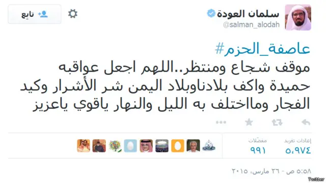 وبنفس نبرة التأييد، قال الداعية الإسلامي الشهير سلمان العودة في حسابه على توتير: "#عاصفة_الحزم موقف شجاع ومنتظر.. اللهم اجعل عواقبه حميدة واكف بلادنا وبلاد اليمن شر الأشرار وكيد الفجار وما اختلف به الليل والنهار يا قوي ياعزيز."