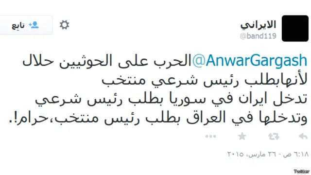 وقال ما أطلق على نفسه "الإيراني": "الحرب على الحوثيين حلال لأنها بطلب رئيس شرعي منتخب تدخل إيران في سوريا بطلب رئيس شرعي وتدخلها في العراق بطلب رئيس منتخب، حرام!"