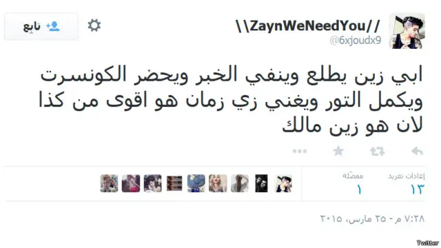 وتمنى المستخدم ZaynWeNeedYou نفي مالك الخبر والعدول عنه: "إبي زين يطلع وينفي الخبر ويحضر الكونسرت ويكمل التور ويغني زي زمان هو أقوى من كذا لأن هو زين مالك."