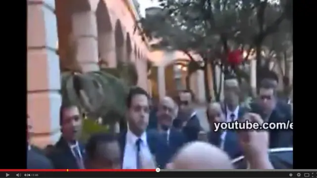ويظهر في الفيديو، الذي تداوله النشطاء على مواقع التواصل الاجتماعي ويوتيوب، مجهولا وهو يحاول اختراق الطوق الأمني المفروض على السيسي اثناء دخول أحد المباني، ويقدم له وردة.