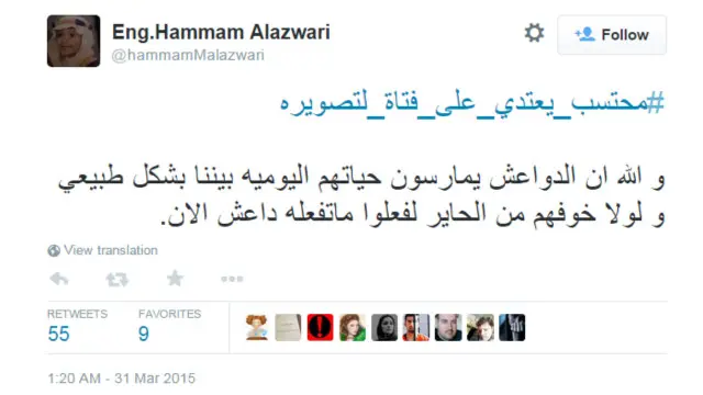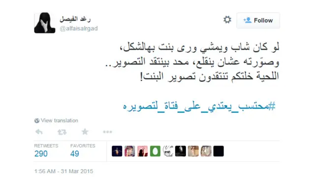 انتشر بين مستخدمي تويتر في السعودية هاشتاغ #محتسب_يعتدي_على_فتاة_لتصويره الذي نشر من خلاله المغردون مقطع فيديو يظهر رجلاً يتقدم نحو الشخص الذي يقوم بالتصوير ويوجه ضربة اليه. وبحسب المغردين فإن الرجل يعمل "محتسب"، أي "موظف رسمي يراقب أفعال الأفراد وتصرفاتهم أمراً بالمعروف ونهياً عن المنكر"، وأنه وجه الضربة لفتاة كانت تصوره بكاميرا هاتفها المحمول.