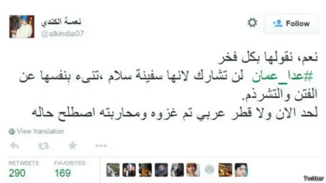 واكد المغردون العُمانيون ان سبب امتناع بلادهم عن المشاركة هو أن عُمان بلد سلام، وقال احدهم، المدون نعمة الكندي: "نعم، نقولها بكل فخر عُمان لن تشارك لأنها سفينة سلام، تنئ بِنفسها عن الفتن والتشرذم. لحد الان ولا قطر عربي تم غزوه ومحاربته اصطلح حاله".