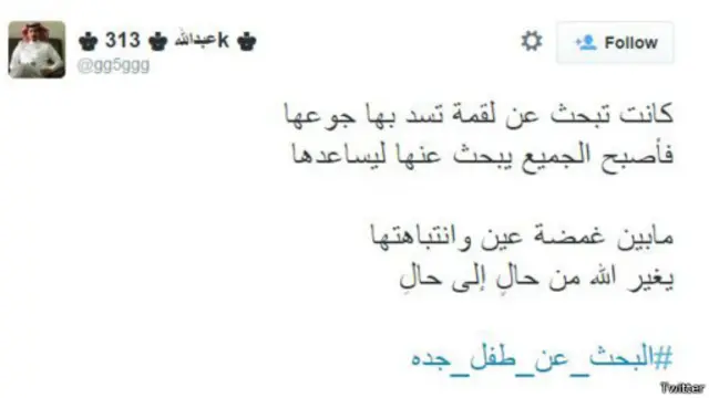قال المغرد عبد الله في هذا السياق : "كانت تبحث عن لقمة تسد بها جوعها فأصبح الجميع يبحث عنها ليساعدها مابين غمضة عين وانتباهتها يغير الله من حالٍ إلى حالِ"