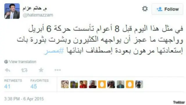 قال المغرد حاتم عزام :" في مثل هذا اليوم قبل 8 أعوام تأسست حركة 6 أبريل وواجهت ما عجز أن يوجهه الكثيرون وبشرت بثورة بات إستعادتها مرهون بعودة اصطفاف ابنائها مصر".
