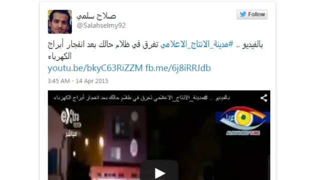 ركز مستخدمو تويتر في مصر على انقطاع التيار الكهربائي في مدينة الإنتاج الإعلامي التي تعتبر أكبر مجمع للفضائيات المصرية والعربية التي تبث من مصر. وكان "انفجار عبوة ناسفة" في أحد أبراج الكهرباء الرئيسية أدى الى توقف بث عدد من القنوات لأكثر من ساعة، وأطلق المغردون هاشتاغ #مدينة_الإنتاج_الإعلامي لمناقشة الموضوع ليظهر الهاشتاغ في أكثر من 9 آلاف تغريدة.