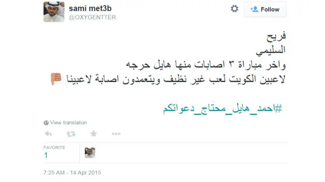 كما انتقد العديد من المستخدمين طريقة اللعب في الكويت، فقال المستخدم سامي متعب: "فريح السليمي واخر مباراة ٣ اصابات منها هايل حرجه لاعبين الكويت لعب غير نظيف ويتعمدون اصابة لاعبينا #احمد_هايل_محتاج_دعواتكم".