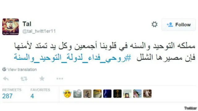 فقال مدون باسم "طال" في هذا السياق: "مملكة التوحيد والسنة في قلوبنا أجمعين وكل يد تمتد لأمنها فإن مصيرها الشلل #روحي_فداء_لدولة_التوحيد_والسنة".