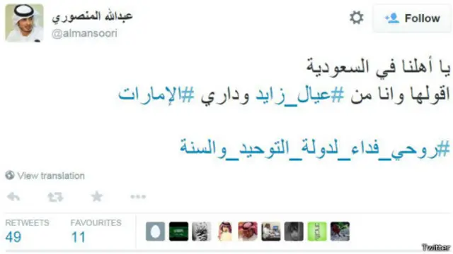 وأضاف عبدالله المنصوري: "يا أهلنا في السعودية اقولها وانا من عيال زايد وداري الإمارات #روحي_فداء_لدولة_التوحيد_والسنة".