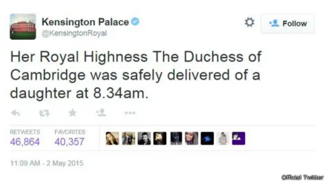 وللمرة الأولى بتاريخ بريطانيا، أعلن قصر كينسينغتون الخبر رسمياً في تغريدة نشرها على تويتر تقول: "في الساعة 8.34 صباحاً (بتوقيت لندن) وضعت صاحبة السمو دوقة كمبريدج طفلة بسلامة".