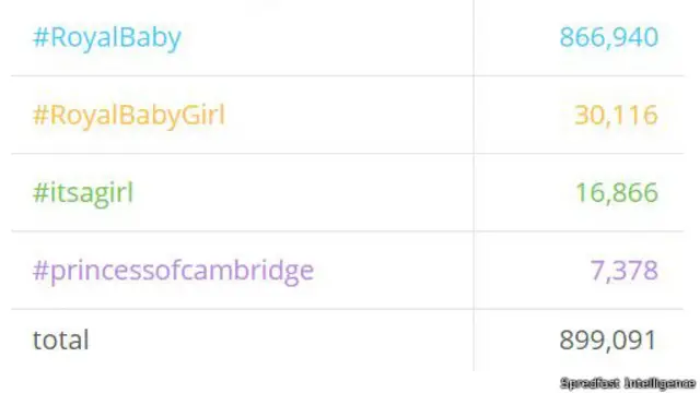 أبدى مغردون حول العالم اهتماماً كبيراً بخبر ولادة أميرة بريطانية جديدة، واحتفوا بذلك من خلال إطلاق عدد من الهاشتاغات نذكر منها #RoyalBaby و #RoyalBabyGirl و #itsagirl و #princessofcambridge التي ظهرت في نحو 900 ألف تغريدة.
