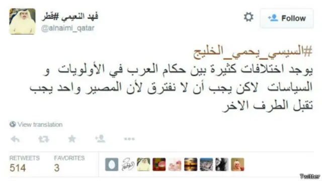 لكن بالمقابل، هناك من رأى أن التضامن العربي ضروري لأن المصير العربي واحد، على حد قول فهد النعيمي الذي غرد قائلاً: "يوجد اختلافات كثيرة بين حكام العرب في الأولويات و السياسات، لكن يجب أن لا نفترق لأن المصير واحد. يجب تقبل الطرف الاخر".