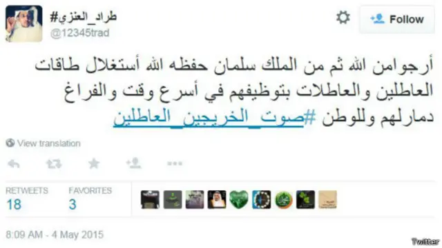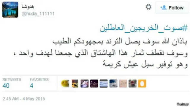 أطلق مغردون في السعودية هاشتاغ #صوت_الخريجين_العاطلين الذي ظهر في نحو 39 ألف تغريدة، وذلك لمطالبة ملك السعودية بتوظيف العاطلين والعاطلات عن العمل، على حد قول المدون طراد العنزي الذي كتب: "أرجو من الله ثم من الملك سلمان حفظه الله استغلال طاقات العاطلين والعاطلات بتوظيفهم في أسرع وقت، فالفراغ دمار لهم وللوطن".
