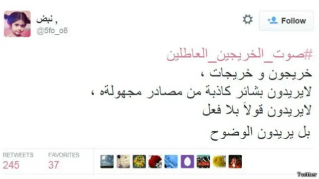 وأشار مدونون انهم لا يريدون "بشائر كاذبة"، أحدهم مستخدم باسم "نبض" الذي قال: "خريجون وخريجات لا يريدون بشائر كاذبة من مصادر مجهولة، لا يريدون قولاً بلا فعل، بل يريدون الوضوح".