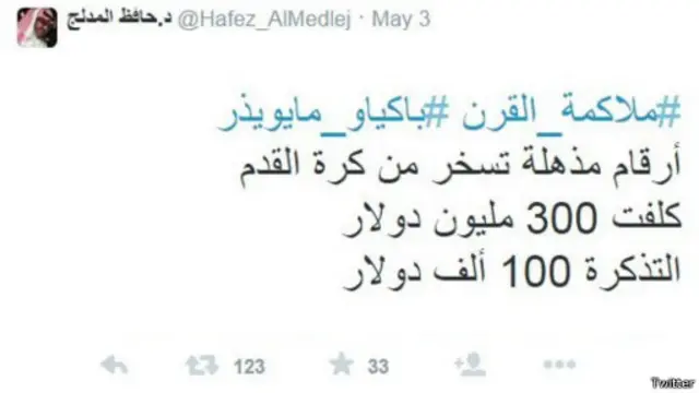 دشن مغردون في عدد من الدول العربية هاشتاغ #ملاكمة_القرن تفاعلاً مع مباراة الملاكمة التي جرت ليلة السبت على حلبة غراند غاردن في مدينة لاس فيغاس الأمريكية بين الأمريكي فلويد مايوذر والفلبيني ماني باكياو، والتي فاز بها الأمريكي مايوذر.