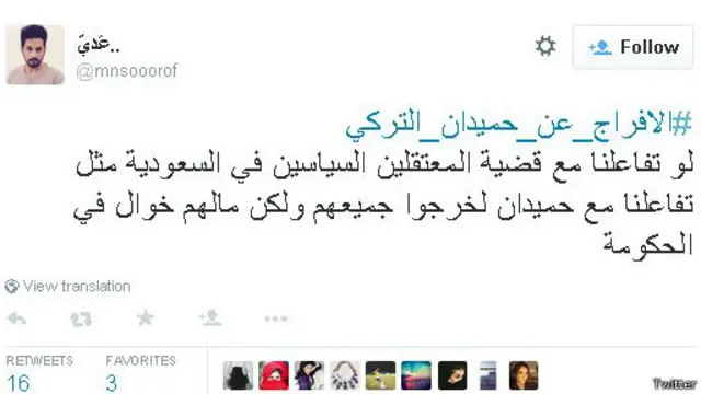 وجاءت التغريدات في مجملها متضامنة مع التركي، مطالبة السلطات السعودية بمساعدته.