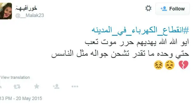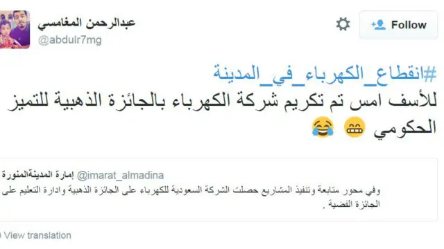 وسخر آخرون من تكريم شركة الكهرباء السعودية وحصولها على الجائزة الذهبية للتميز الحكومي قبل يوم واحد فقط من انقطاع الكهرباء.
