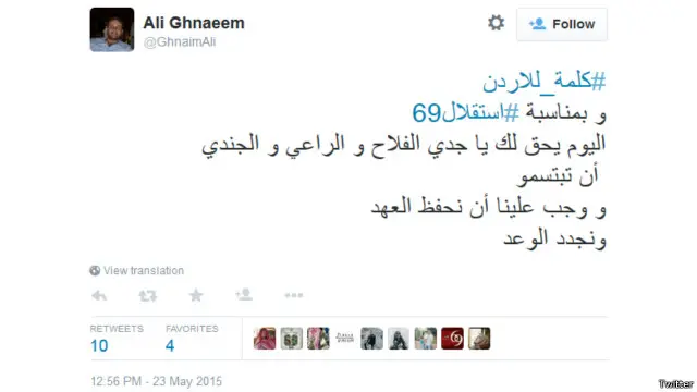 أطلق مغردون في الأردن هاشتاغ #استقلال69 للاحتفال بعيد استقلال بلادهم الذي يصادف 25 مايو / أيار من كل عام، والذي تحتفل فيه البلاد بذكرى خروج القوات البريطانية عام 1946 بعد موافقة الأمم المتحدة على إنهاء الانتداب البريطاني والاعتراف بالمملكة.