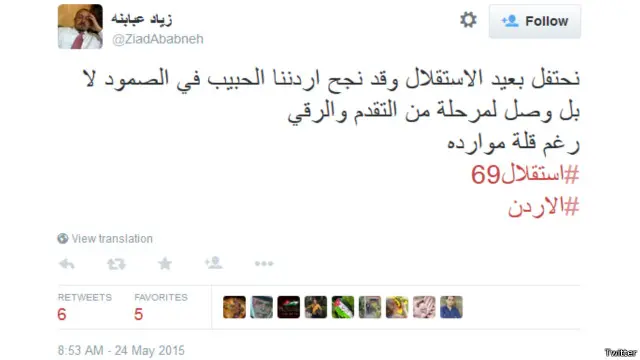 وظهر الهاشتاغ في أكثر من 7 آلاف تغريدة احتفل فيها مغردون بالمناسبة أيضاً، نذكر منهم زياد عبابنة الذي قال: "نحتفل بعيد الاستقلال. وقد نجح أردننا الحبيب في الصمود، لا بل وصل لمرحلة من التقدم والرقي رغم قلة موارده".
