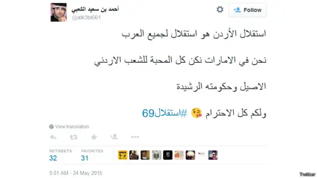 وتقدم عدد من مستخدمي تويتر غير الأردنيين بتهانيهم للشعب الأردني بالمناسبة أيضاً، مثل المدون الإماراتي أحمد بن سعيد الكعبي الذي قال: "استقلال الأردن هو استقلال لجميع العرب. نحن في الإمارات نكن كل المحبة للشعب الأردني الأصيل، وحكومته الرشيدة. ولكم كل الاحترام".