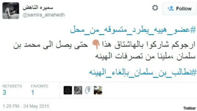 اهتم مغردون في السعودية بهاشتاغ #نطالب_بن_سلمان_بإلغاء_الهيئة الذي اطلقته المدونة السعودية سميرة الناهض في تغريدة طالبت فيها ملك السعودية بإلغاء هيئة الأمر بالمعروف والنهي عن المنكر. وجاء طلبها هذا عقب انتشار هاشتاغ #عضو_هييه_يطرد_متسوقه_من_محل على تويتر، بالإضافة الى مقطع فيديو على يوتيوب يظهر فيه أحد أعضاء الهيئة وهو يطرد سيدة منقبة من محل تجاري لعدم ارتدائها قفازات.