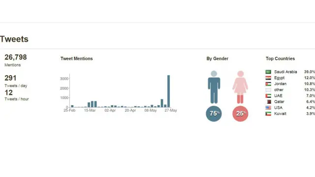 ارتفاع درجة الحرارة في مصر وقضية فساد الاتحاد الدولي لكرة القدم فيفا، وظهور أبو محمد الجولاني زعيم جبهة النصرة السورية، التابعة لتنظيم القاعدة، على قناة الجزيرة أبرز القضايا التي شغلت الرأي العام واستحوذت على اهتمام مستخدمي مواقع التواصل الاجتماعي بالشرق الأوسط.