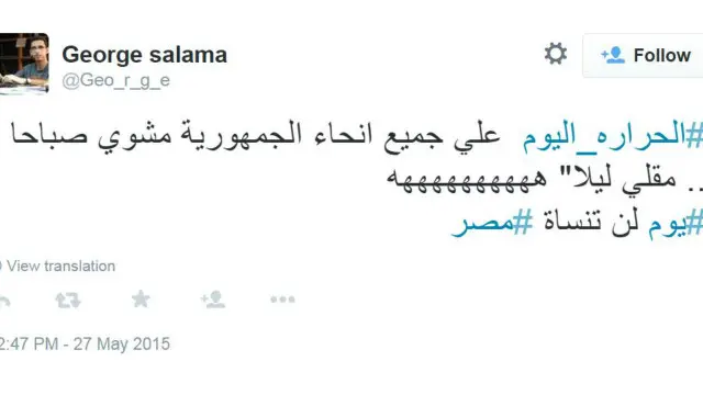 ودشن المستخدمون هاشتاغ (#الحرارة_اليوم)، وظهر في أكثر من 10 آلاف تغريدة، لبيان حال المصريين في الحر وكيفية تعاملهم مع درجات الحرارة المرتفعة.