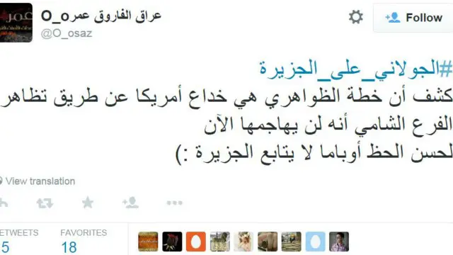 وكتب عراق الفاروق عمر أن الجولاني كشف عن خطة القاعدة لخداع أمريكا على قناة الجزيرة، ولحسن الحظ أن الرئيس الأمريكي باراك أوباما لا يتابعها.
