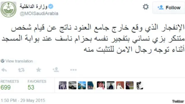 ونشر حساب وزارة الداخلية تغريدة تقول فيها ان الانتحاري كان متنكرا بزي نسائي.