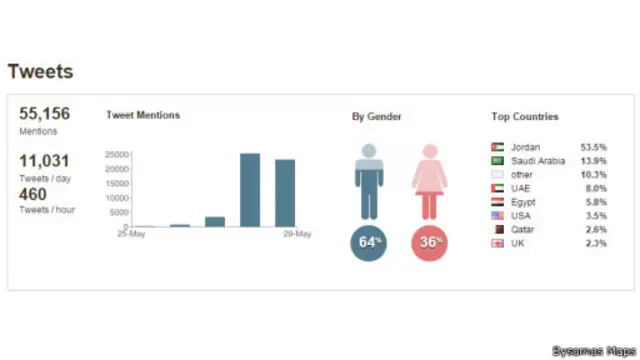 إليكم رسم توضيحي يظهر عدد التغريدات على مدار الأسبوع، وأكثر البلدان استخداما للهاشتاغ.