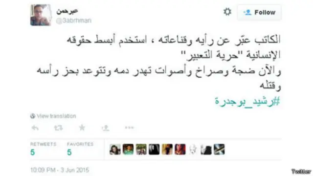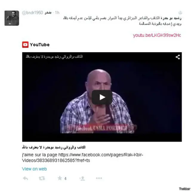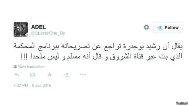 وطالب آخرون باحترام الرأي المخالف، فعلق المغرد بشير بوزيان الرحماني بالقول : "اختلف مع #رشيد_بوجدرة، لكنني أدافع عن حقه في حرية الرأي والاعتقاد."