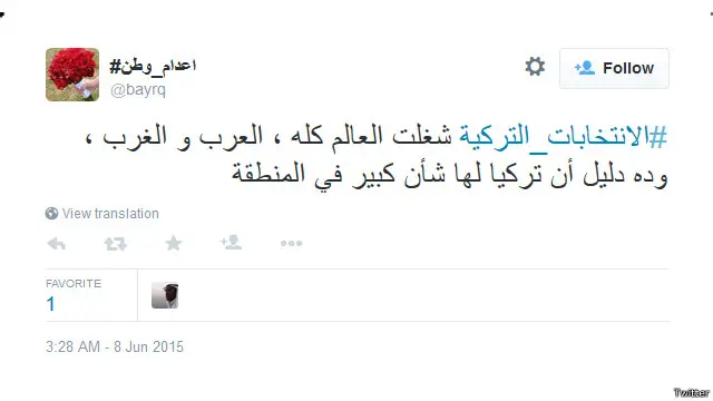 واشار مغردون الى ان اهتمام العرب بهذه الانتخابات يدل على شأن تركيا الكبير في المنطقة، أحدهم مدون باسم "بيرق" الذي قال: "#الانتخابات_التركية شغلت العالم كله، العرب والغرب، وده دليل أن تركيا لها شأن كبير في المنطقة".