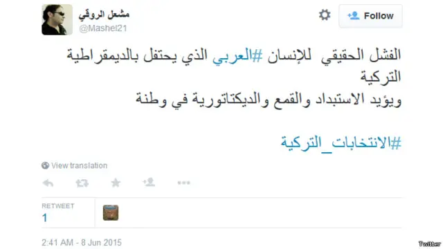 لكن هناك من اعتبر أن اهتمام العرب بالانتخابات التركية يعتبر تناقضاً، احدهم مشعل الروقي الذي قال: "الفشل الحقيقي للإنسان العربي الذي يحتفل بالديمقراطية التركية ويؤيد الاستبداد والقمع والديكتاتورية في وطنه".