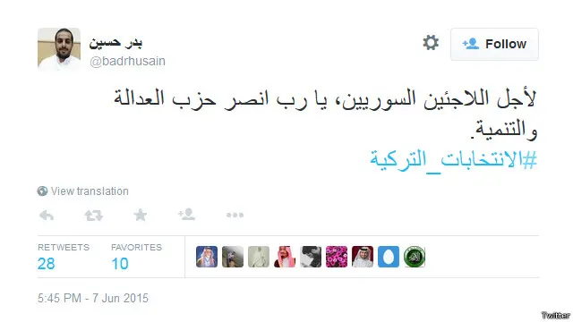 كما ظهرت العديد من التغريدات المؤيدة لحزب العدالة والتنمية بسبب موقفها من استقبال اللاجئين السوريين "يوم اغلقت حكومات أخرى أبوابها أمامهم" على حد قول المدون عبدالرحمن بن علي. كما قال المستخدم بدر حسين: "لأجل اللاجئين السوريين، يا رب انصر حزب العدالة والتنمية".