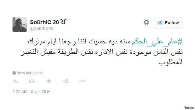 كما قال حساب باسم sobrhic20@: "سنة ديه حسيت اننا رجعنا ايام مبارك، نفس الناس موجودة، نفس الإداره، نفس الطريقة، مفيش التغيير المطلوب".