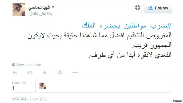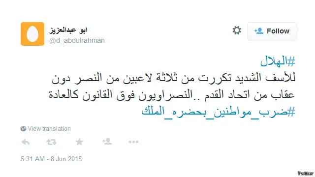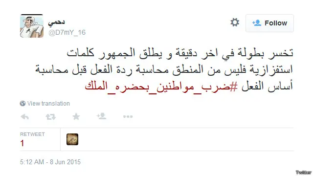 دشن مغردون في السعودية هاشتاغ #ضرب_مواطنين_بحضرة_الملك، تعليقاً على تعدي عدد من لاعبي فريق النصر لكرة القدم بالضرب على بعض المشجعين عقب مباراتهم مع فريق الهلال في نهائي كأس الملك يوم السبت 6 يونيو / حزيران.