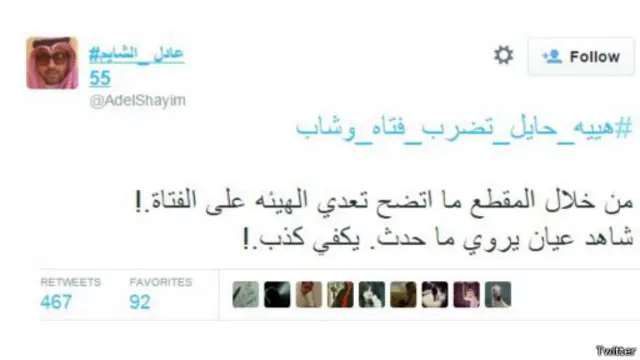 وقال مغردون إن المقطع يُصور ضرب أحد أعضاء هيئة الأمر بالمعروف والنهي عن المنكر لشاب وشابة في إحدى مراكز التسوق في مدينة حائل شمال غرب السعودية. ولم يتسن لبي بي سي التأكد من صحة ما ورد على تويتر بسبب رداءة التصوير، إلا أن صرخات شابة تُسمع بوضوح خلال التصوير.