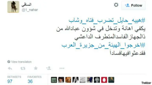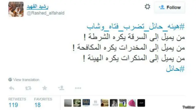 أطلق مغردون في السعودية هاشتاغ #هيئه_حائل_تضرب_فتاه_وشاب الذي تداولوا من خلاله <link type="page"><caption> مقطع فيديو</caption><url href="https://www.youtube.com/watch?v=cepNI2O8Vcg" platform="highweb"/></link> تمت متابعته على يوتيوب أكثر من 44 الف مرة منذ نشره بتاريخ 8 يونيو / حزيران.