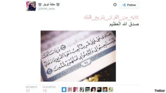 كما دشنوا هاشتاغ #اية_من_القران_بتريح_قلبك الذي كتبوا من خلاله آيات قصيرة أو اسماء سور من القرآن الكريم بالإضافة الى أسماء الأشخاص الذين يشتهرون بتلاوتها، وظهر هذا الهاشتاغ بدوره في نحو 12 ألف تغريدة.