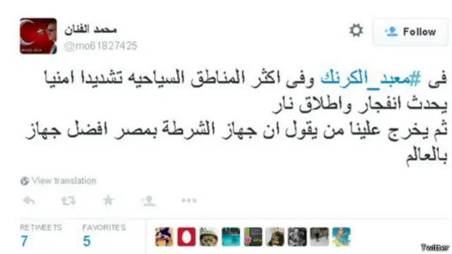 وأشادت المغردة مرمر جبار برجال الشرطة، وعلقت مستنكرة ما حدث : "تحية تقدير واعزاز لرجال الشرطة المحترمين اللي بشجاعتهم انقذوا معبد الكرنك وآثاره العظيمة والغلابة اللي بيسترزقوا منه."