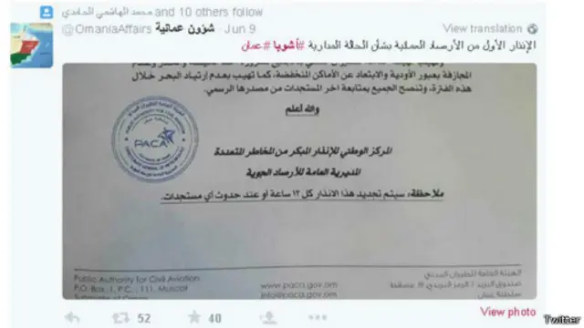 كما تداول مغردو السلطنة آخر الأنباء المتعلقة بالإعصار، وتبادلوا المنشورات التحذيرية التي أصدرها المركز الإقلمي.