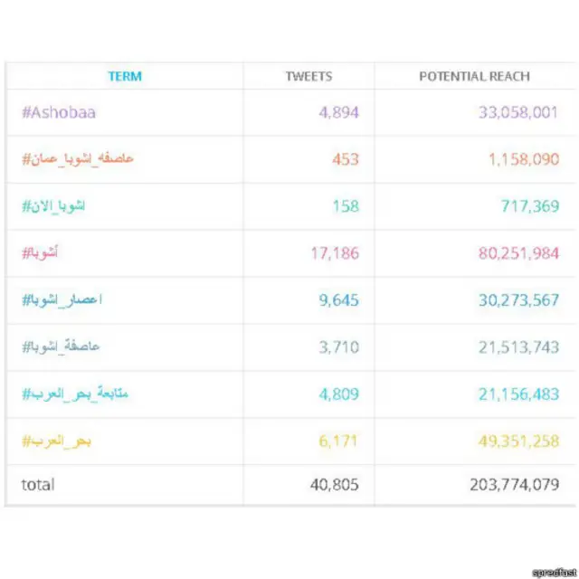 واستخدم مغردون هاشتاغات حملت اسم العاصفة التي سميت بـ "أشوبا"، ليصل بذلك عدد التغريدات إلى 60 ألف تغريدة، كما يظهر في الرسم التوضيحي التالي.