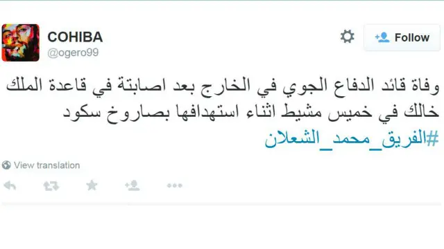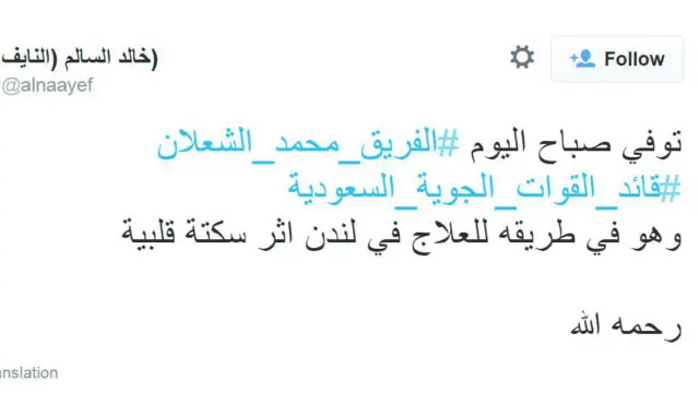 وفي المملكة العربية السعودية تفاعل المستخدمون مع خبر وفاة قائد القوات الجوية الملكية السعودية، الفريق الركن محمد بن أحمد الشعلان، والذي أثار العديد من التساؤلات حول أسباب الوفاة.