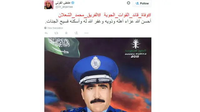 وكتب الداعية السعودي، عائض القرني، معزيا السعوديين في وفاة الشعلان في تغريدة له.